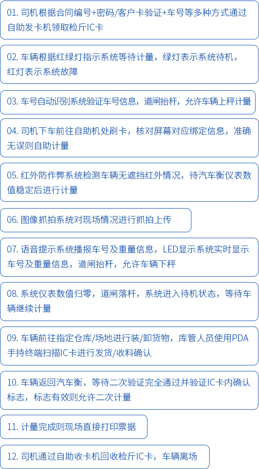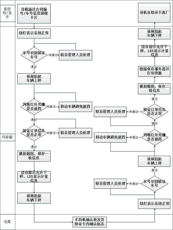 有自助機版稱重系統按功能性劃分,主要由以下幾個小系統組成:自助收/發卡系統,數字式電子汽車衡系統,自助終端智能處理系統,IC驗證系統,車號自動識別系統,圖像抓拍與視頻監控系統,LED顯示系統,紅外防作弊系統,紅綠燈指示系統,語音提示系統,道閘限流系統,PDA手持終端確認等。