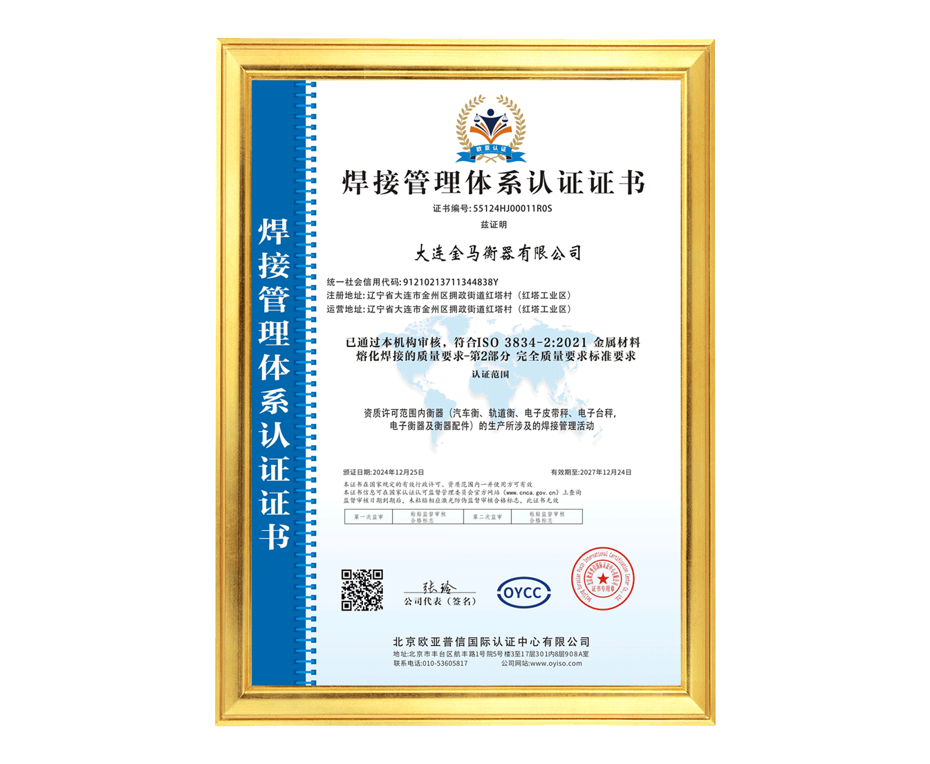焊接管理體系認(rèn)證證書