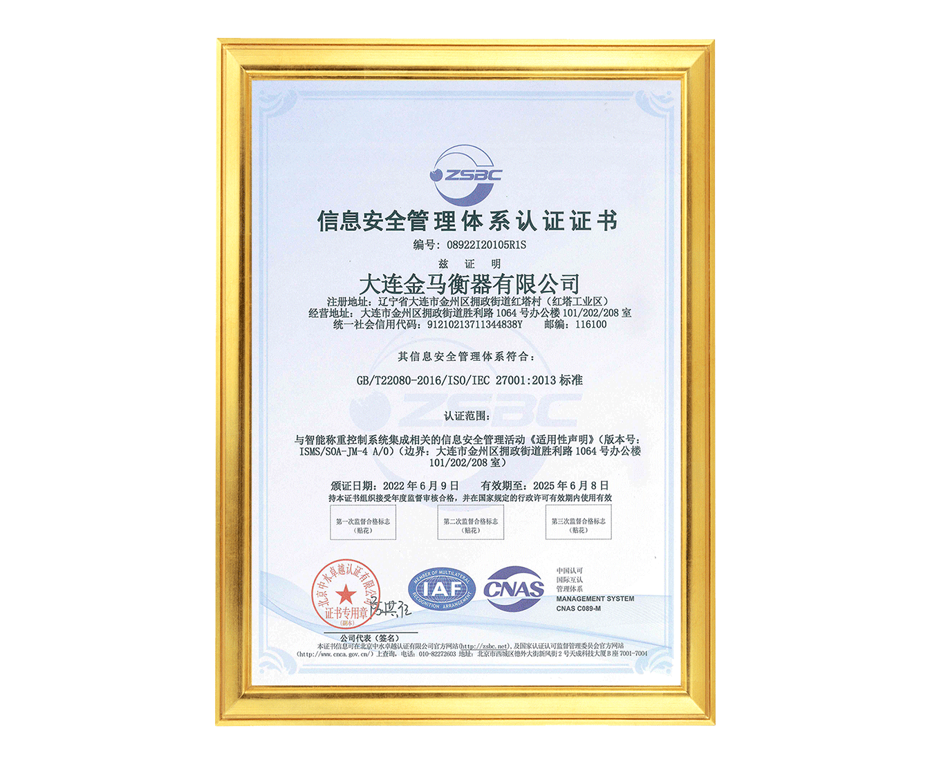 信息安全管理體系認(rèn)證證書